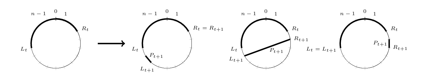 At t=4, we have the choices {5,6}, {6,5} and {5,6}. Say we choose \(P_4 = \{5,6\}\), we have \([L_4,R_4]=[7,6]=\{7,0,1,2,3,4,5,6\}\).