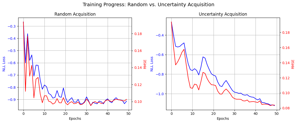 Both strategies reduce the loss of the model. The uncertainty based method acquires more points from the peripheries — that is, when \(x\) is close to \(\pi\) or \(-\pi\) whereas random method samples uniformly.