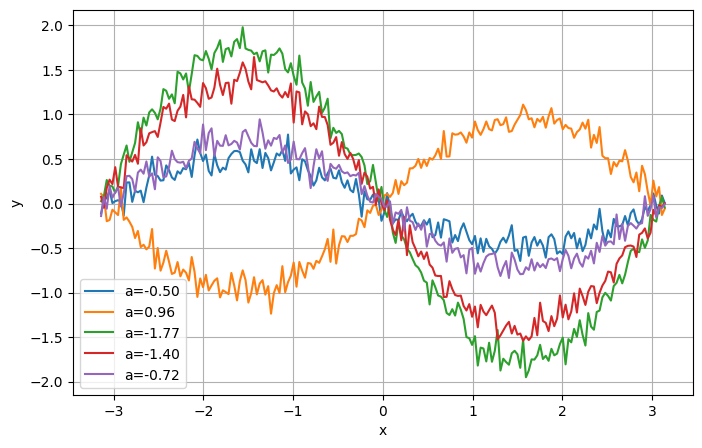 Instead of training on a fixed dataset, our model learns by seeing functions. In every training step, we generate a new sine wave of the form \(𝑦=𝑎sin(𝑥)\) where the amplitude \(𝑎\) is randomly chosen from a uniform distribution in (-2,2). Then we randomly sample points from this function to be context points and target points. We have also added random gaussian noise to our data.