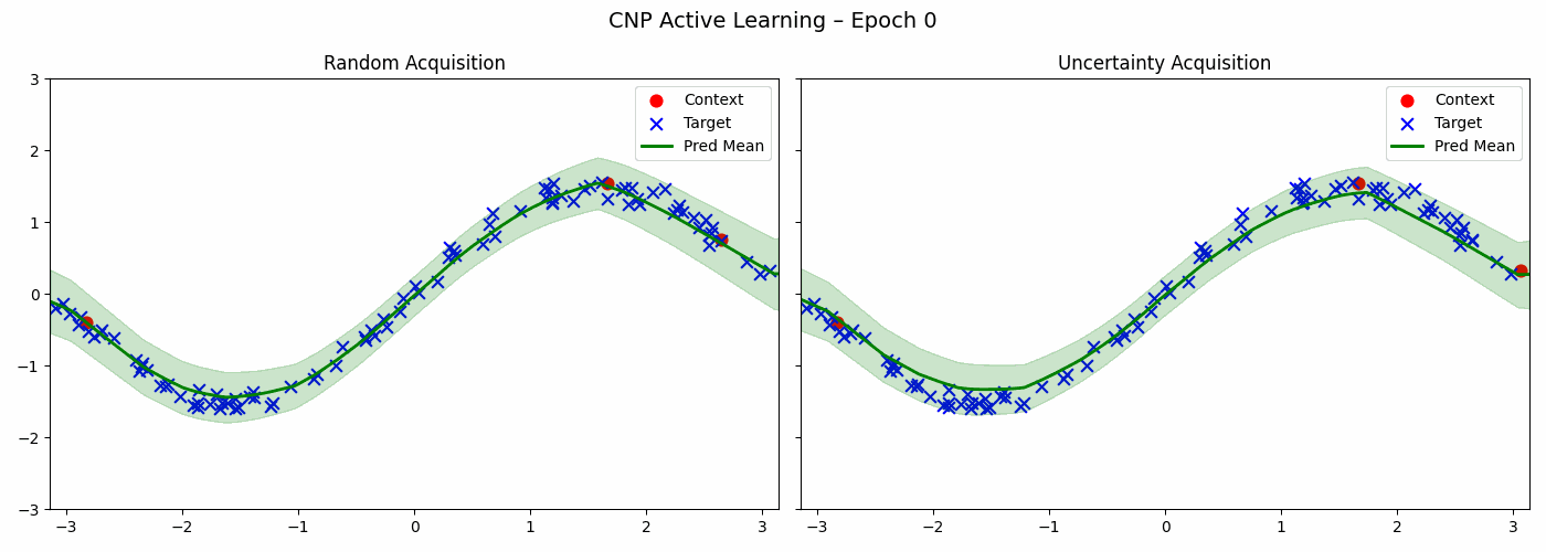 The CNP trained above can help us in choosing the next points to acquire in order to make even better predictions about a particular sine wave. Below is the code for two acquisitions strategies - a random strategy and an uncertainty based strategy which chooses point with maximum variance.